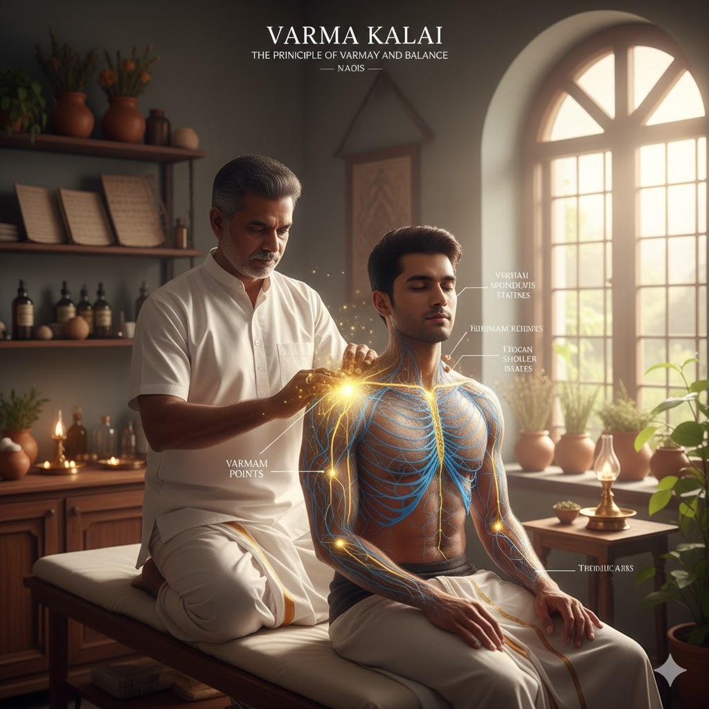 - The Three Humors (Muppini): Like all Siddha therapies, Varma aims to balance the Muppini—Vatham (Air), Pitham (Fire), and Kappam (Water). An imbalance in these humors, often caused by a blockage or trauma to a Varmam point, leads to disease.