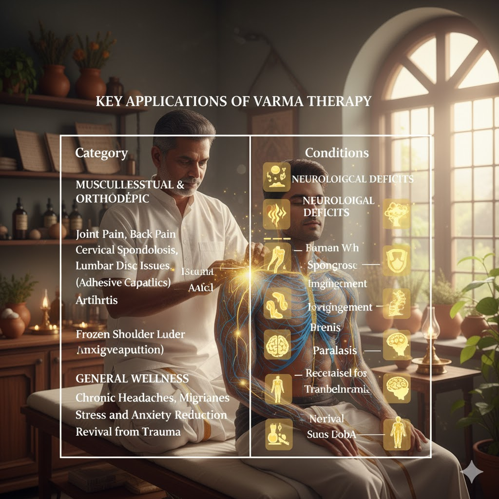 Varma Therapy is highly versatile and effective as a drugless therapy for a wide range of conditions, particularly those involving pain and functional limitations.